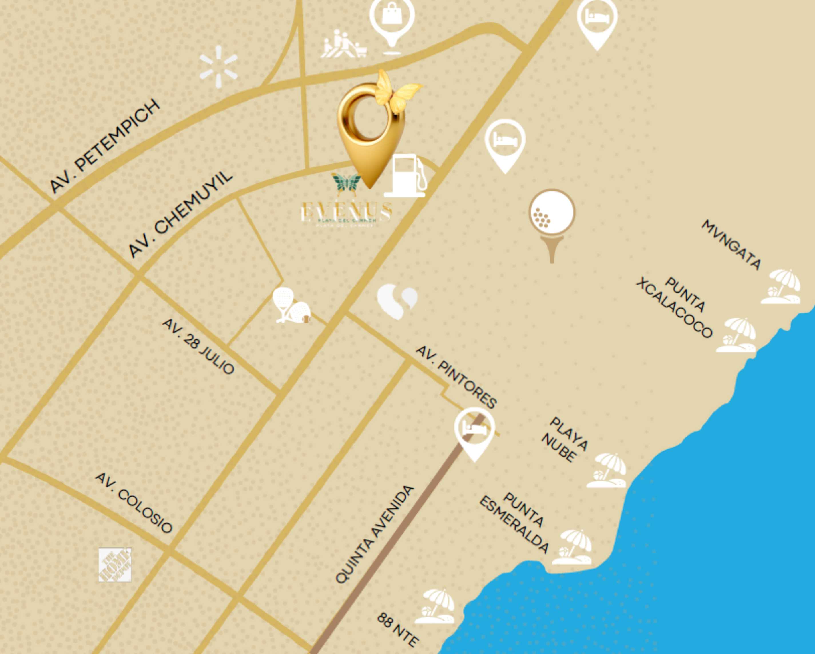 - Sólo 5 minutos en auto a Playa Punta Esmeralda, Playa Xcalacoco y el acceso a exclusivos clubes de playa y campo de Golf.